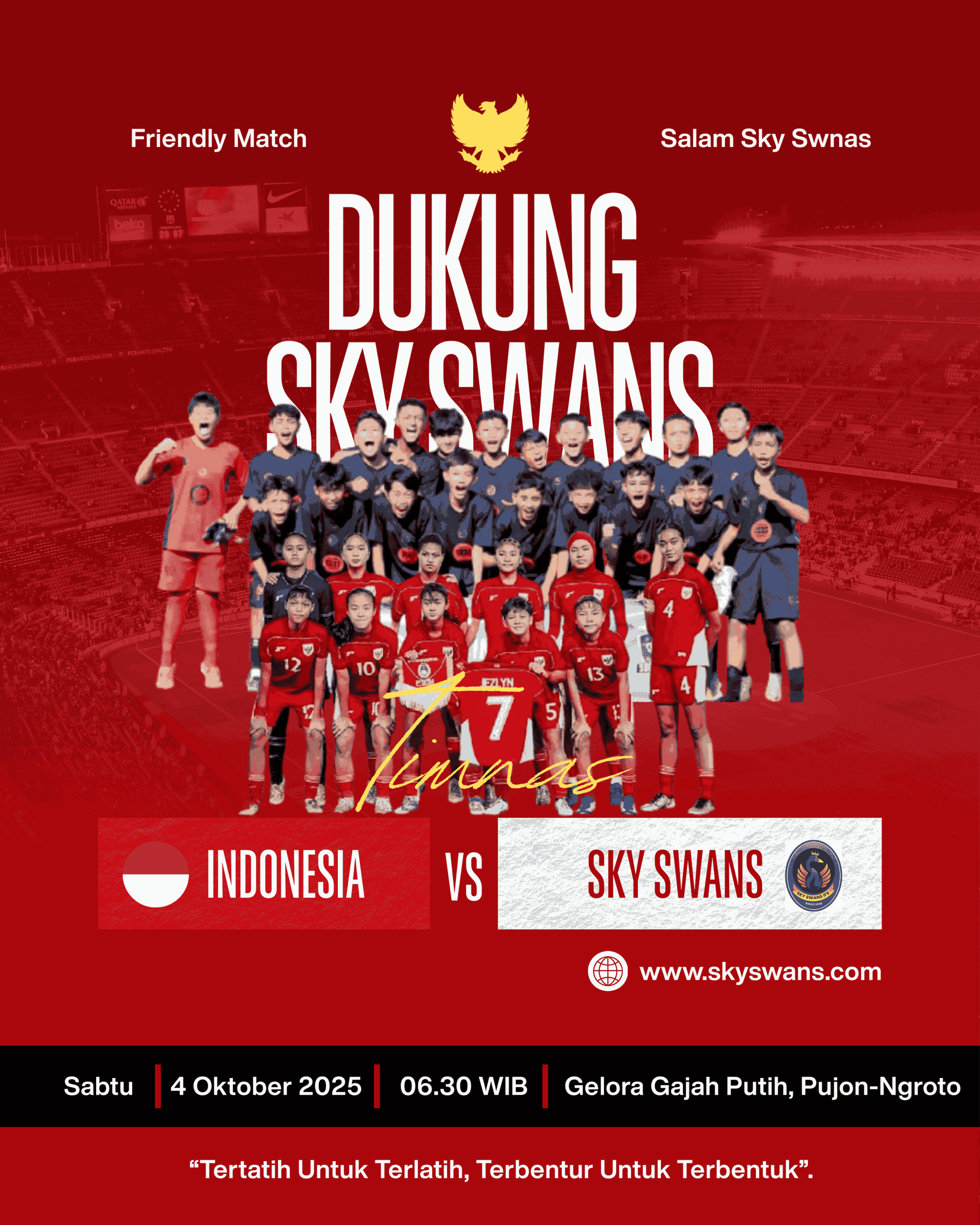 Pujon Ngroto, 4 Oktober 2025 – Suporter sepak bola bersiaplah! Pertandingan seru akan tersaji di Gelora Gajah Putih, Pujon Ngroto, pada Sabtu, 4 Oktober 2025 pukul 06.30 WIB. Tim kebanggaan kita, Sky Swans, akan menantang langsung Timnas Indonesia dalam laga yang dipastikan penuh gengsi dan semangat juang.